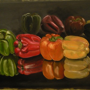 Oil Painting completed April 2010 Still life of 4 different coloured capsicums on a reflective black background and base. – Capsicums, it blows my mind that they come in so many colours! Every time I saw them at the fruit market I just wanted to paint them. Had to work quickly as fruit goes … More Colourful Capsicums