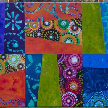 Happy Quilt is my first acrylic painting and I took the design from a Colourful quilt that my beautiful sister Anne made for me for my 50th birthday.